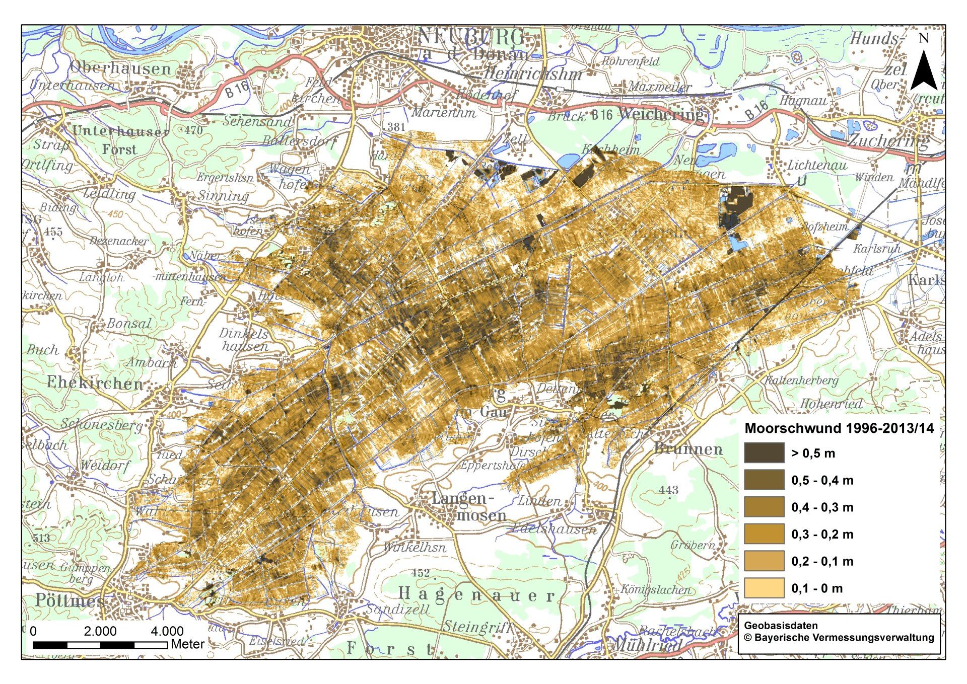 Durch das Eindringen von Luftsauerstoff in den Torfkörper erfolgt ein sogenannter oxidativer Torfverzehr. Jährlich ist dadurch ein Verlust von einem bis zwei Zentimetern Torfboden zu verzeichnen. Problematisch ist dabei, dass enorme Mengen an klimawirksamen Gasen freigesetzt werden. Für das Donaumoos bestehen Berechnungen mit rund 400.000 Tonnen CO2-Äquivalenten pro Jahr, die durch diese Prozesse freigesetzt werden. Bis in das 20. Jahrhundert hinein wurde zudem flächendeckend Torf gestochen und als Brennstoff verwendet. Durch diese Gegebenheiten sind seit Beginn der Kultivierung des Donaumooses etwa drei Meter Moorauflage und rund ein Drittel der ursprünglichen Moorfläche verloren gegangen.