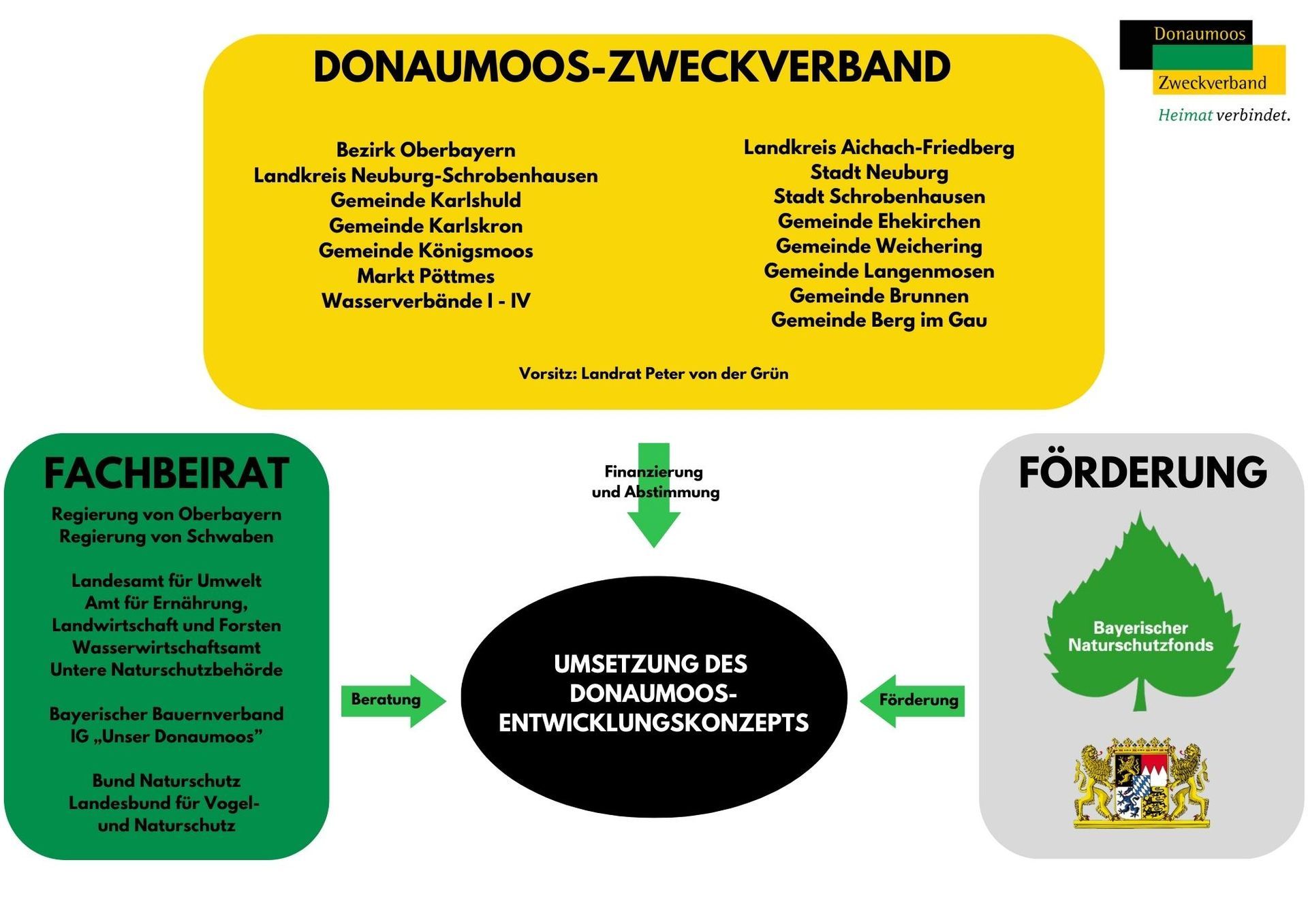 Die Mitglieder des Donaumoos-Zweckverbands, des beratenden Fachbeirats sowie der Fördergeber sind in folgendem Diagramm dargestellt: